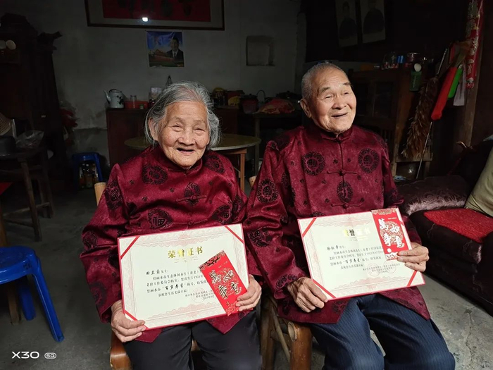 除徐献章、田兰菊百岁夫妻外,缙云还有总年龄超过190岁的夫妻。他们是:仙都街道铁城村梅宅自然村梅碧仙家庭,妻子100岁,丈夫99岁,总年龄199岁;东方镇胪膛村陈章根家庭,丈夫100岁,妻子97岁,总年龄197岁;东方镇东方村下东方自然村徐陈品家庭,丈夫100岁,妻子97岁,总年龄197岁;胡源乡胡开明家庭,丈夫101岁,妻子93岁,总年龄194岁;五云街道施子昆家庭,丈夫100岁,妻子93岁,总年龄193岁,他们婚龄均超70年,夫妻琴瑟和鸣,伉俪情深!