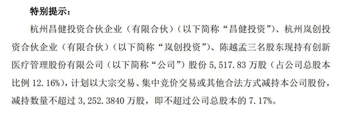 一则是,杭州昌健投资合伙企业(有限合伙)(以下简称“昌健投资”)、杭州岚创投资合伙企业(有限合伙)(以下简称“岚创投资”)、陈越孟三名股东,计划以大宗交易、集中竞价交易或其他合法方式减持不超过3252.384万股股份,占总股本的7.17%。