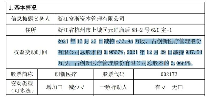 同日另一则消息是,股东富浙资本披露,其在2021年12月22日减持433.98万股,12月29日减持937.53万股,合计减持股份占创新医疗总股本的3.02%,减持后仅剩1.01%的股份。