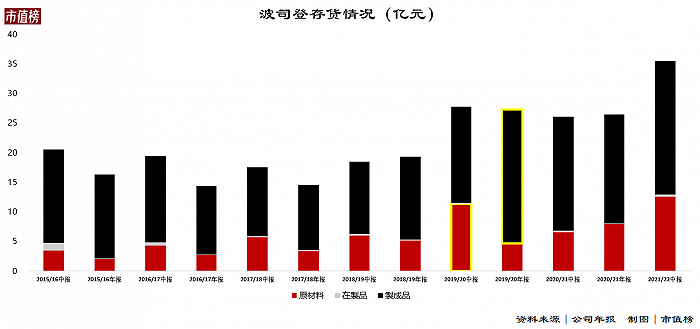 到了2020年3月底,波司登存货中的制成品出现了最高值,22.64亿元。