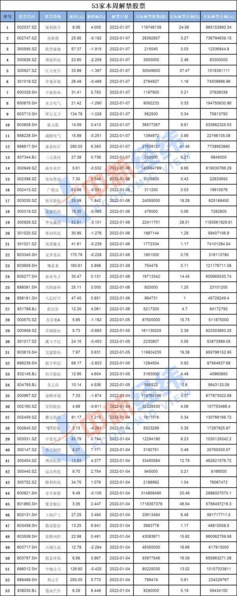 中新经纬1月4日电 2022年首周A股53家公司解禁,市值超400亿。值得注意的是,中微公司市值解禁超过百亿,紫金银行总计解禁17.18亿股的限售股,占总股本的46.94%。