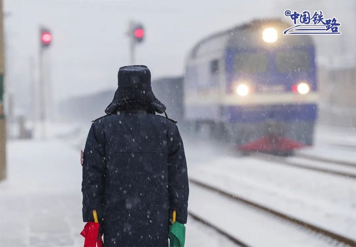 大雪天气下的货运机车整装待发。柳永泉 摄