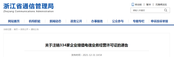 浙江省通信管理局注销334家企业增值电信业务经营许可证