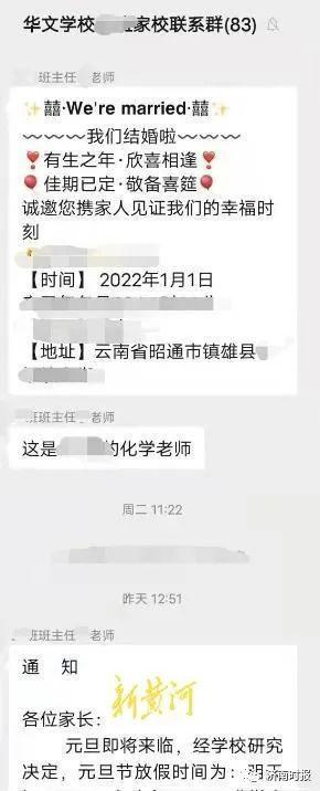 “2021年12月下旬,班主任老师在家长群里发了一个结婚请柬,并告诉家长这是他们班级化学老师的婚礼。婚礼举行的时间是元旦当天,地点在老师的老家。”该班级学生家长李振(化名)截取了家长群截图发给新黄河记者。聊天内容显示,班主任老师告诉学生如何坐车到达婚礼现场,并称“有空的家长陪同孩子去玩一下”。