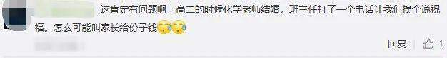 群里家长开始回复班主任,让其询问自己家的孩子是否想要去参加化学老师的婚礼。“有不少家长在群里聊天,表示自己家孩子会去化学老师婚礼。过了一天后,不少家长开始陆续在群里给班主任发红包转账。”李振说,当前疫情不容忽视,有家长担心影响,没有让孩子去参加婚礼,而是在群里给班主任发红包让其将心意带给化学老师。对此,也有学生家长没有发红包,而是直接将钱给了孩子现场交给老师,也有孩子买礼物送给老师。