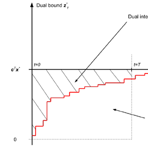 主办方提供了三个 MILP 数据集,它们来自完全不同的现实问题,参赛者可以针对这三个数据集提交不同的模型。其中 Dual Task 赛道研究如何更快收紧 MILP 问题的约束边界,参赛者需要最小化 Dual Integral(如下图所示,最小化积分区域面积),模型效果最后转化为一个累计的奖励函数。