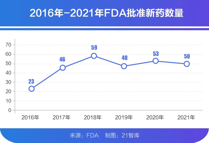 2021年,据21世纪新健康研究院统计,国家药监局共批准76个新药(不包含新适应症、疫苗),远超2020年的48个。其中,由国家药监局批准上市的创新药有26款(不含疫苗和中药创新药),这一数量创近3年来新高。2020年为14款,2019年则为16款。此外,2021年经国家药监局批准上市的中药创新药为12款。