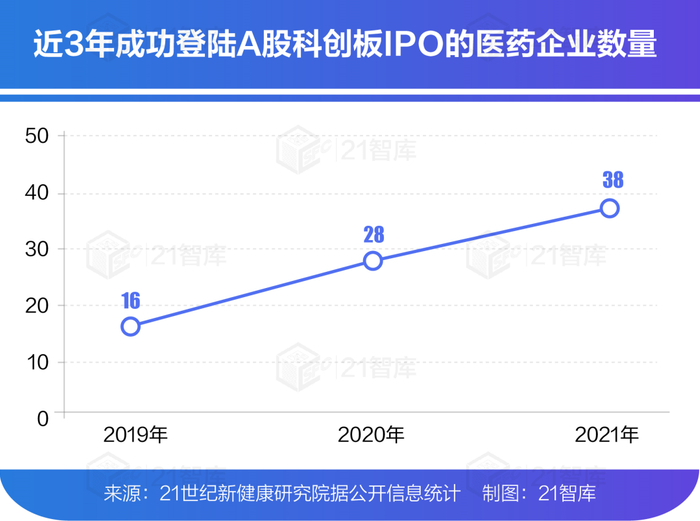 此外,据21世纪新健康研究院初步统计,2021年成功登陆A股科创板的医药企业共38家,而2020年科创板上市药企数量为28家,2019年为16家。