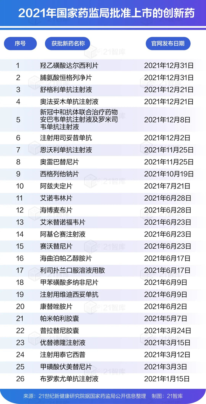 据21世纪新健康研究院统计,2021年国家药监局共批准76个新药(不包含新适应症、疫苗),远超2020年的48个。其中,由国家药监局批准上市的创新药有26款(不含疫苗和中药创新药),这一数量创近3年来新高。