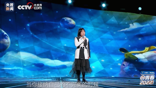 《@青春,2022!》节目主舞台有多酷炫?以中国天眼FAST的“问”为核心灵感,结合科技与未来元素,由曲面悬浮舞台、升降屏幕与垂直冰屏三大部分构成此次节目的独特符号↓