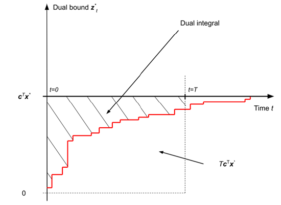 主办方提供了三个 MILP 数据集,它们来自完全不同的现实问题,参赛者可以针对这三个数据集提交不同的模型。其中 Dual Task 赛道研究如何更快收紧 MILP 问题的约束边界,参赛者需要最小化 Dual Integral(如下图所示,最小化积分区域面积),模型效果最后转化为一个累计的奖励函数。