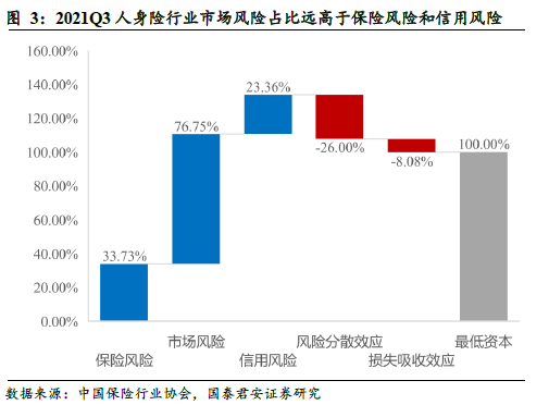 偿二代二期工程核心解决的问题之二在于优化最低资本结构,降低资产端操纵风险。最低资本由保险风险、市场风险和信用风险组成,当前最低资本要求结构相对不合理,其中保险风险和信用风险占比较低、市场风险占比较高,因而保险公司主要通过调整资产结构而非负债结构来提升偿付能力。数据显示,2021年三季度,人身险行业市场风险占比高达76.75%,而保险风险和信用风险的占比分别仅为33.73%和23.36%。