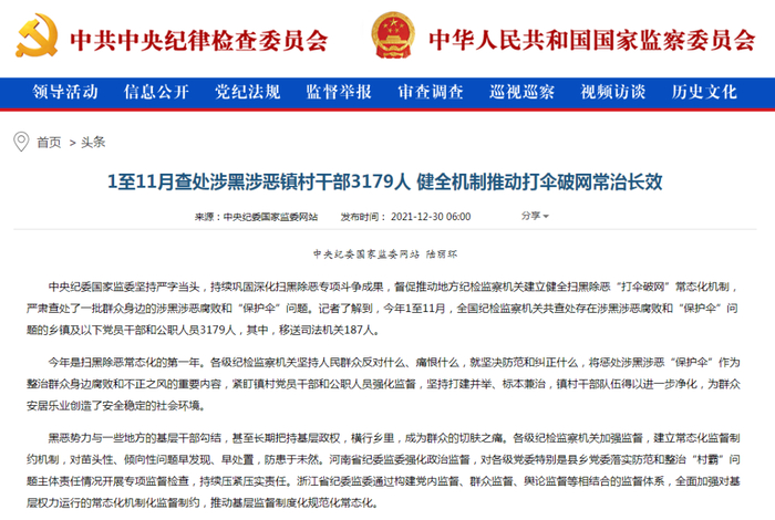 扫黑除恶常态化!2021年1至11月查处涉黑涉恶镇村干部3179人