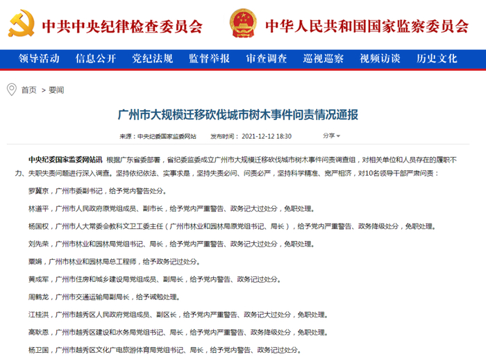 2021年12月12日,广州市大规模迁移砍伐城市树木事件问责情况通报发布,广州市委副书记罗冀京、广州市人民政府原副市长林道平等10名领导干部被问责。通报显示,广州市大规模迁移砍伐城市树木,严重损毁了一批大树老树,破坏了城市自然生态环境和历史文化风貌,伤害了人民群众对城市的美好记忆和深厚感情,是典型的破坏性“建设”行为,造成了重大负面影响和不可挽回的损失,错误严重,教训深刻。