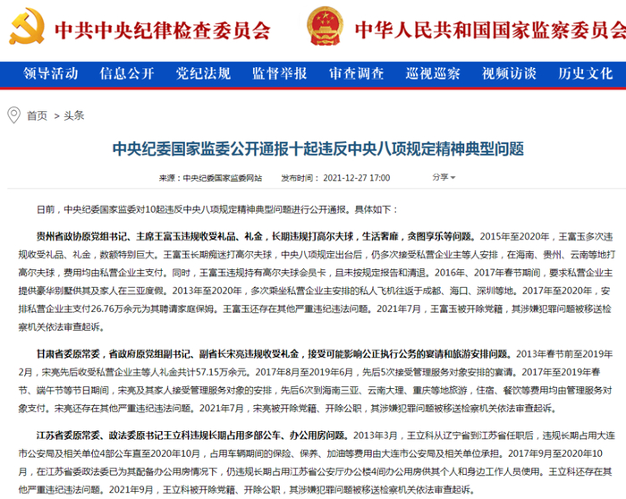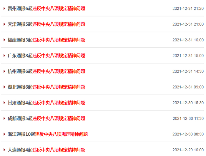 2021年12月27日,中央纪委国家监委公开通报十起违反中央八项规定精神典型问题,其中5起为中管干部风腐一体的严重违纪违法案件,5起为厅局级以下干部违反中央八项规定精神的问题。临近节点,北京、贵州、广东、杭州等各地纪检监察机关也密集通报违反中央八项规定精神典型问题一百余起,涵盖违规收送名贵特产和礼品礼金、违规吃喝、违规发放津补贴或福利等常见“四风”问题。