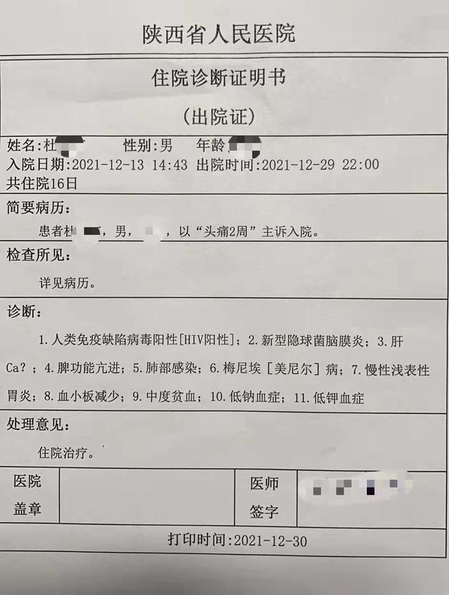 1月4日,杜先生告诉新京报记者,2021年12月1日,他父亲出现了发热症状,家人本以为这只是普通感冒,然而12天后,病情未见好转的父亲又出现了听力下降、头痛严重的状况,家人遂带其前往陕西省人民医院进行检查。