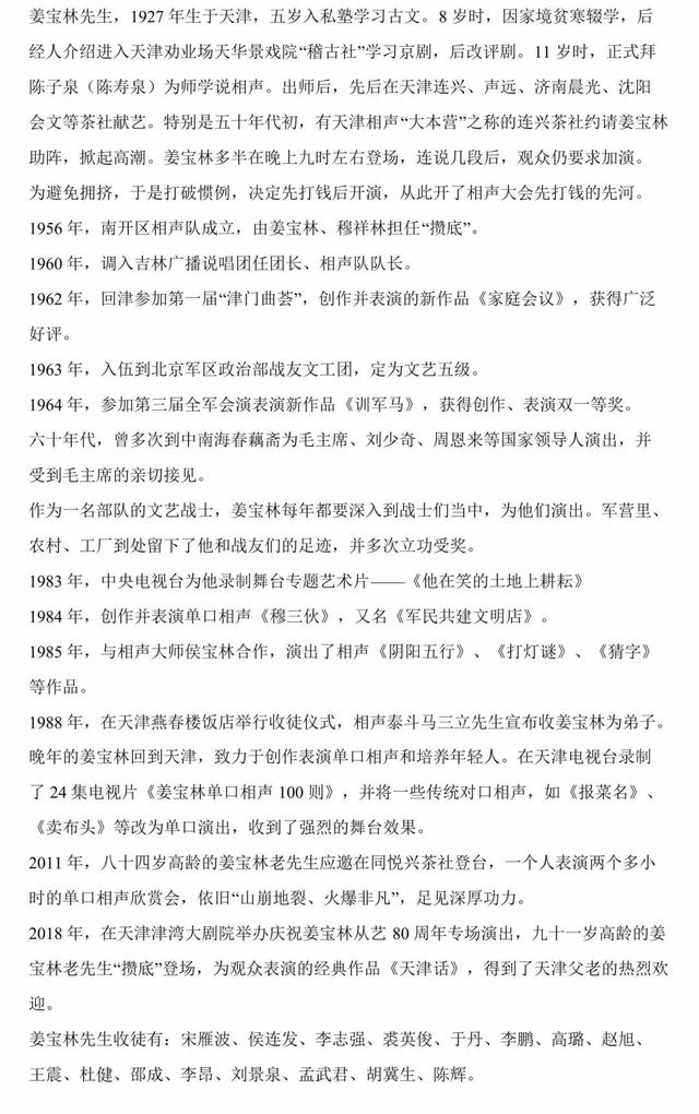 姜宝林先生生前是北京军区政治部文工团副军级艺术指导,国家一级演员,南开大学、天津大学等7所高等学府的客座教授。由他创编的相声《家庭会议》《训军马》《穆三伙》《装聋学哑》《婆媳对话》等名段至今依旧在相声迷的口中广为传诵。