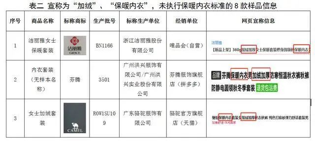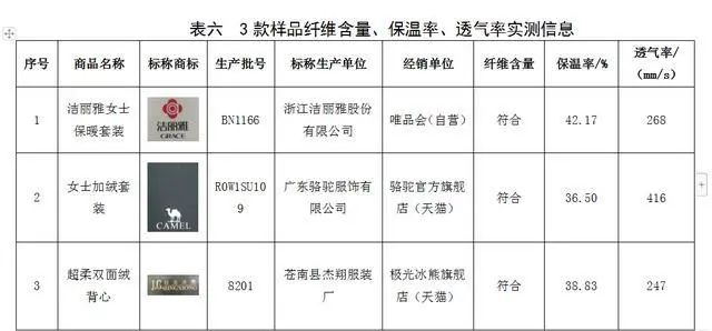 购自“唯品会(自营)”的标称商标为“洁丽雅”女士保暖套装、购自“天猫”的标称商标为“骆驼”女士加绒套装和“极光冰熊”超柔双面绒背心样品,纤维含量、保温率、透气率实测值符合《针织保暖内衣》。