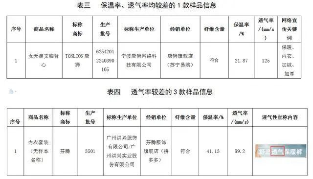 购自“拼多多”的标称商标为“芬腾”内衣套装(无样本名称)样品、购自“京东商城”的标称商标为“俞兆林”保暖内衣和“袋鼠”男士羊毛圆领保暖套装样品透气率实测分别为89.2mm/s、111mm/s、141mm/s,低于《针织保暖内衣》标准规定透气率应≥180mm/s的规定,保温率实测符合《针织保暖内衣》标准。