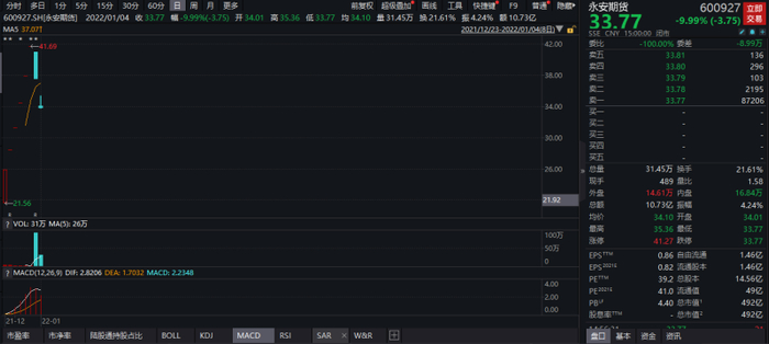 自2021年12月23日上市起,永安期货股价连续6天涨停,正当市场都在猜测“期货一哥”能连续获得几个涨停板时,2021年12月31日,永安期货大幅低开后震荡,收盘跌停,报37.52元/股。
