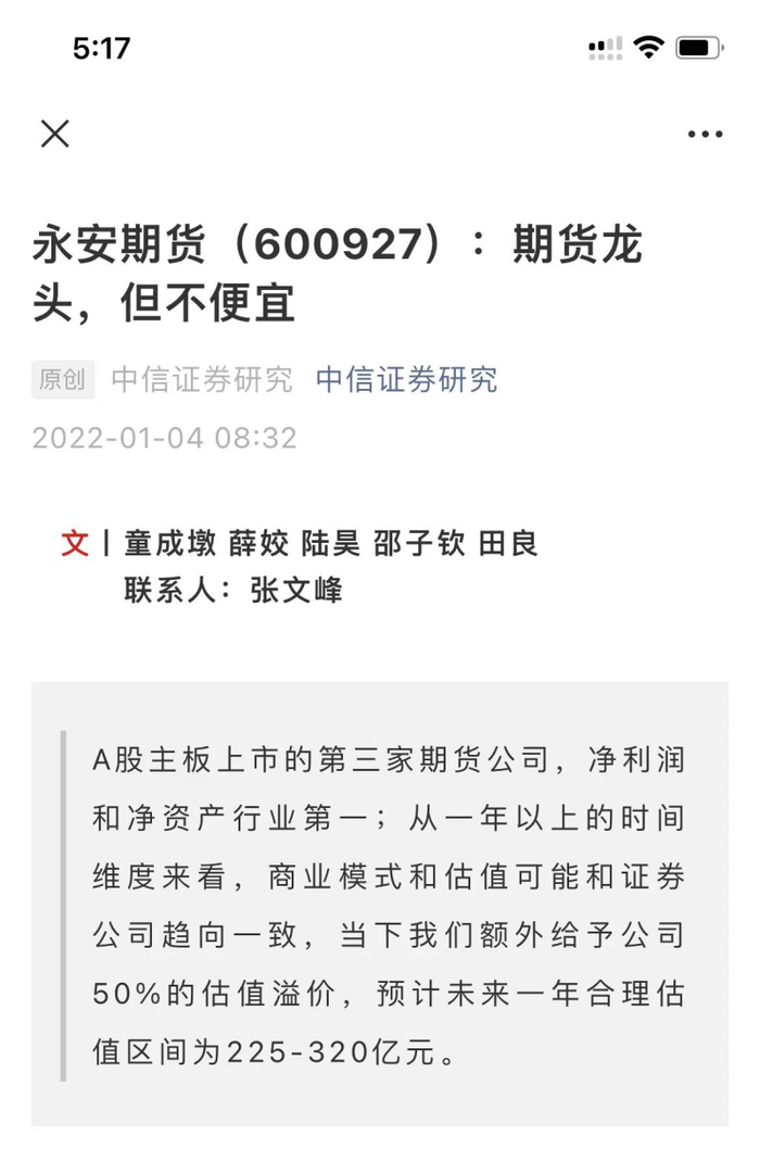 1月4日早间,中信证券研究在其微信公众号发布的《期货龙头,但不便宜》报告中指出,从中长期(一年以上)看,永安期货估值可能趋向券商股估值;以券商估值为基准再给公司50%估值溢价,预计公司未来一年合理估值区间为225-320亿元。如果以1月4日492亿元的市值来看,股价距离中信证券研报的目标价还有约35%的距离。