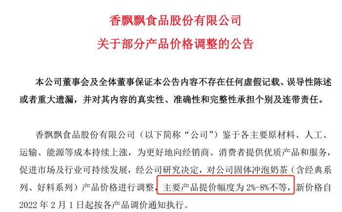 同日宣布涨价的还有奶茶龙头香飘飘。1月4日晚,香飘飘公告称,鉴于各主要原材料、人工、运输、能源等成本持续上涨,为更好地向经销商、消费者提供优质产品和服务,促进市场及行业可持续发展,经公司研究决定,对公司固体冲泡奶茶(含经典系列、好料系列)产品价格进行调整,主要产品提价幅度为2%-8%不等,新价格自2月1日起按各产品调价通知执行。