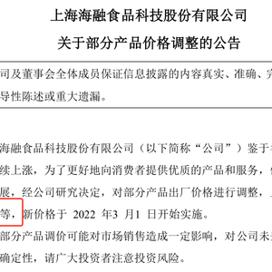 1月4日晚海融科技公告,鉴于各主要原辅料成本持续上涨,为了更好地向消费者提供优质的产品和服务,促进市场的可持续发展,经公司研究决定,对部分产品出厂价格进行调整,上调幅度为5%到8%不等,新价格于3月1日开始实施。