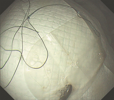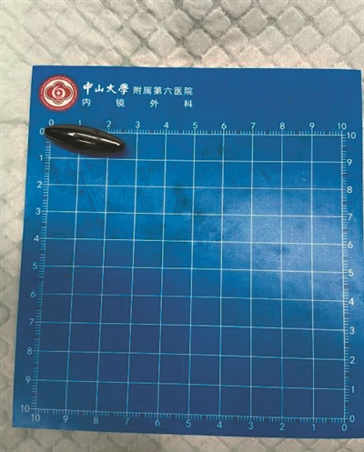 胡健聪尝试用异物钳、圈套器等常规取异物器械,发现都没有办法把磁铁夹住取出。他立即联系手术室,借用手术室腹腔镜常用的无菌标本取出袋,在袋子上绑上丝线,再通过胃镜把标本袋带入胃腔,通过异物钳慢慢像“包饺子”一样把磁铁推入标本袋,最后牵拉丝线经过嘴巴终于把磁铁完整取出。