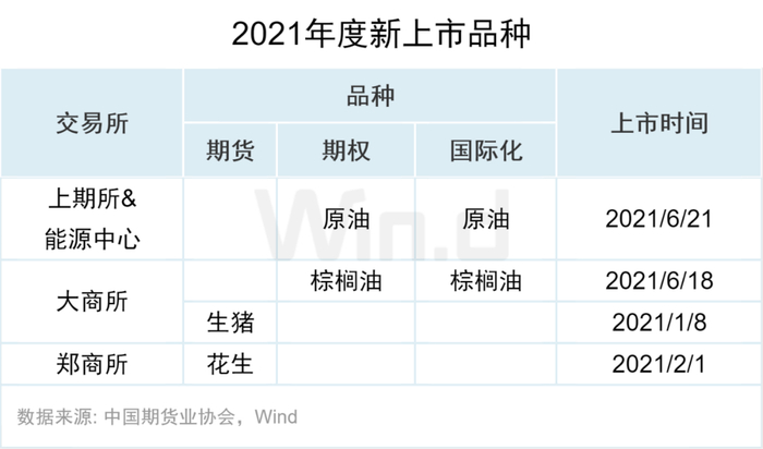 2021年中国期货期权品种上市进度放缓,上市数量为近4年最低。截止2021年底,我国衍生品上市数量总计94个,其中期货品种70个。上期能源的原油期权以及大商所棕榈油期权的上市,有助于相关产业用户进行精细化套期保值。