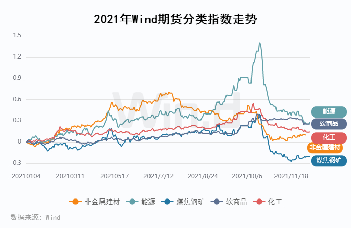 从期货分类指数走势来看,4季度前受到经济复苏预期影响,能源、化工以及煤焦钢矿等指数震荡走高,包含原油,动力煤以及LPG等品种在内的能源指数年度涨幅在21年10月份达到了130%,化工品种也有50%的涨幅。这给相关产业链下游企业带来巨大成本压力。随着相关部门政策的推出,能源、化工品种价格大幅回调,能源指数从最高2250点回落至1100点左右,但较年初仍上涨30%。