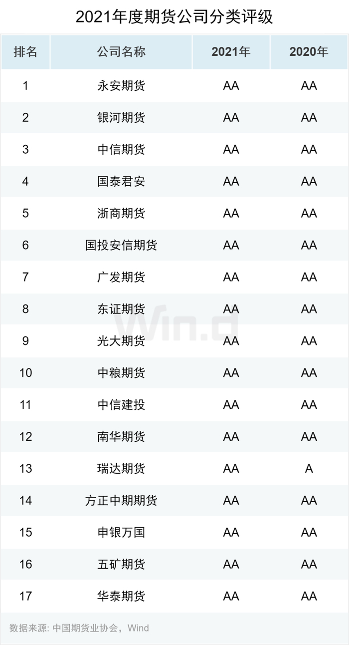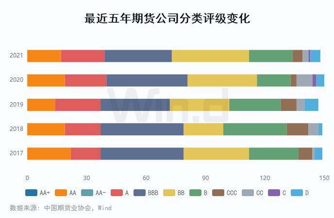 根据中国期货业协会2021年发布的期货公司分类评价结果,150家期货公司中, 17家期货公司被评为AA级,相比去年减少两家;22家被评为A级,BBB级34家。
