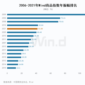 Wind商品指数2021年度振幅高达42%,位列2006年至今振幅第五名,振幅前四位的分别是金融危机的2008、2009年以及大宗商品牛市的2006、2016年。
