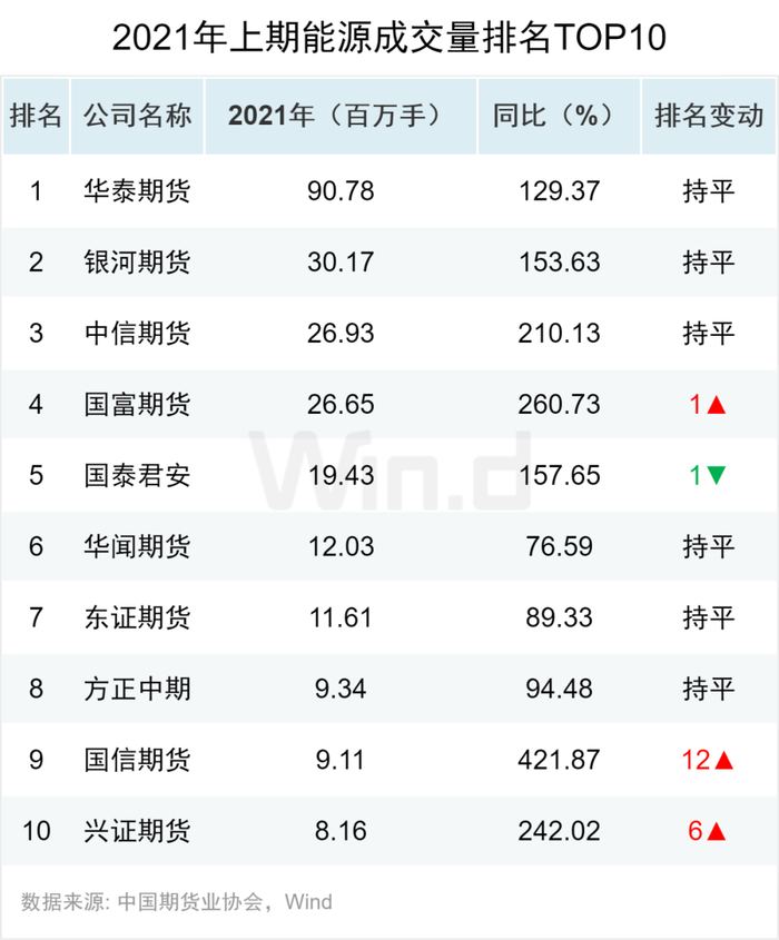 华泰期货以9.08亿手位居上期能源成交量第一位,国信期货、国富期货以及兴证期货分列成交量增速前三位,增速在200%—400%之间。