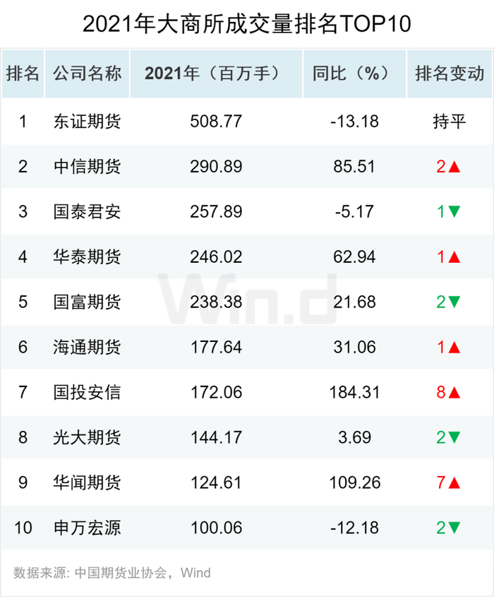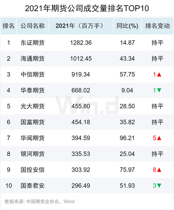 根据2021年全年四大商品期货交易所官网会员成交排名数据统计。东证期货以12.82亿手总成交量蝉联榜首,同比增14.87%。华闻期货以总成交量3.94亿手,同比增加96%,占据总量第七位,增速第一位。国投安信期货上升速度最高,成交量排名提升八位至榜单第九,成交量增速76%。TOP10成交量占全市场的50.17%。