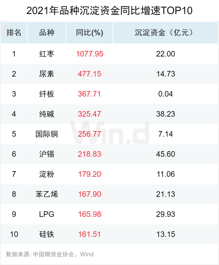 在沉淀资金同比增速方面,红枣以10倍的增幅位于榜单首位,纯碱以325%位列第二,上年度纯碱期货曾以870%位列增速第一。涨幅榜第一的沪锡以218%资金增速位列第六,沉淀资金达45亿元。