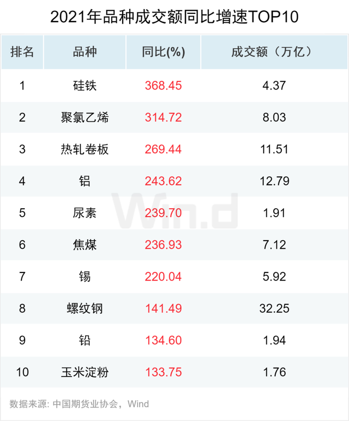 煤焦钢矿各品种仍旧受到市场关注,在新旧能源转型背景下,对黑色的市场关注度不断提升,其中硅铁以368%增速位列成交额增速榜首。TOP10有4个品种与黑色相关。铝是唯一入围前10的有色品种,成交额同比增加243%,成交额突破12万亿元。