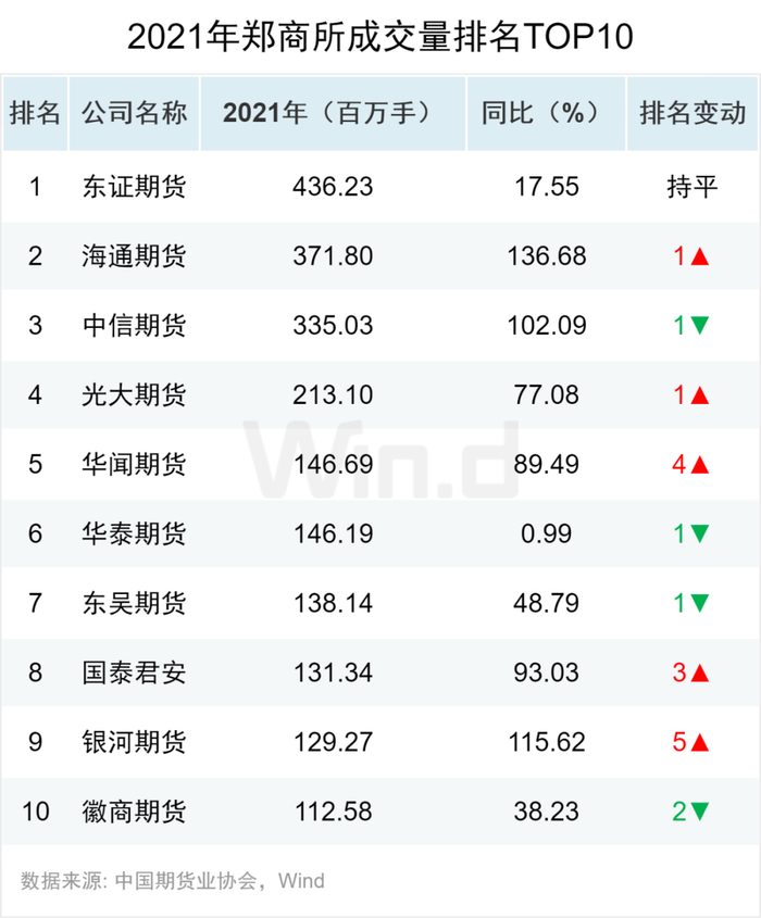 东证期货以4.36亿手位于郑商所成交量排名第一位,同比增加17%。成交量同比增速前三位分别是海通期货、银河期货以及中信期货。