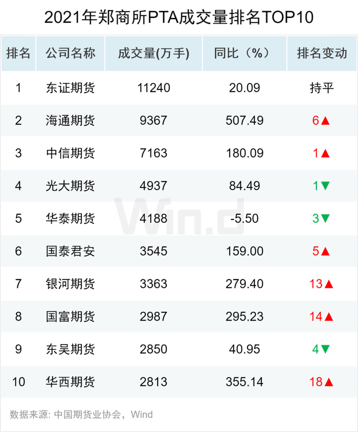 郑商所TA品种成交放大,东证期货成交量同比增加20%,排名第一。海通期货同比增加507%,成交量排名上升6位至第二位。TOP10占全部成交量的47.4%。