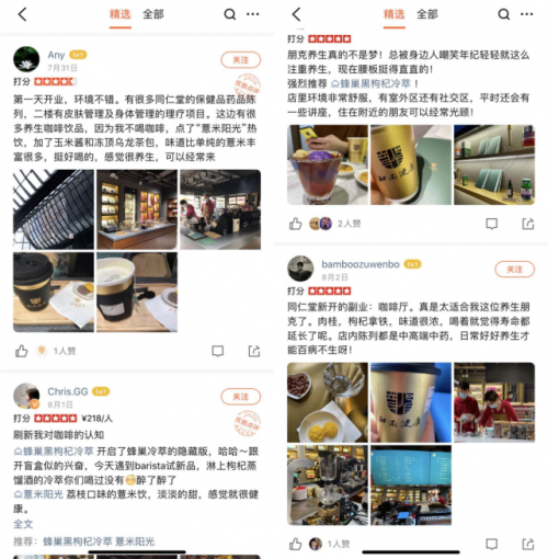 知嘛健康让消费者有了耳目一新的感受,从同仁堂咖啡的大众点评评论中可以看出,大多数用户是认可同仁堂新理念的,大家对咖啡的关键词也集中在“养生”上,这证明同仁堂这波跨界不仅仅在追求热点,也在一定程度上衍生了品牌价值。