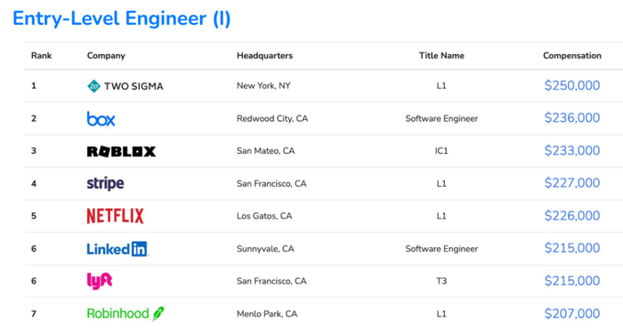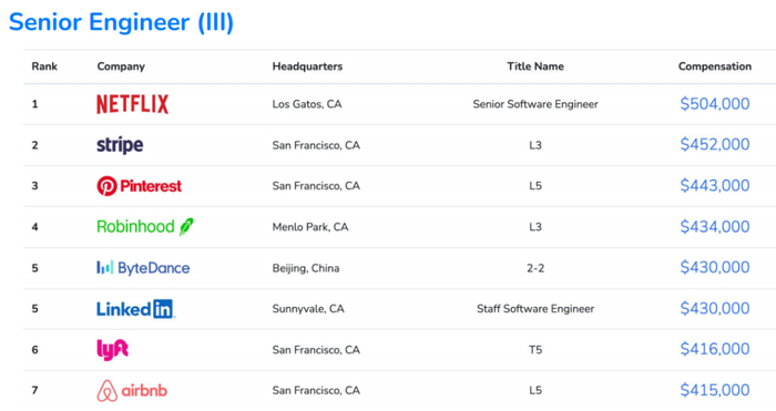 在初级工程师中,排名前七的公司中位数薪资均超过了20万美元,与去年相比,入榜公司的总体薪资呈大幅提升。其中,第四至第七的公司依次为Stripe、Netflix、Linkedln、Lyft、Robinhood,中位数薪资分别为22.7万美元、22.6万美元、21.5万美元、21.5万美元、20.7万美元。