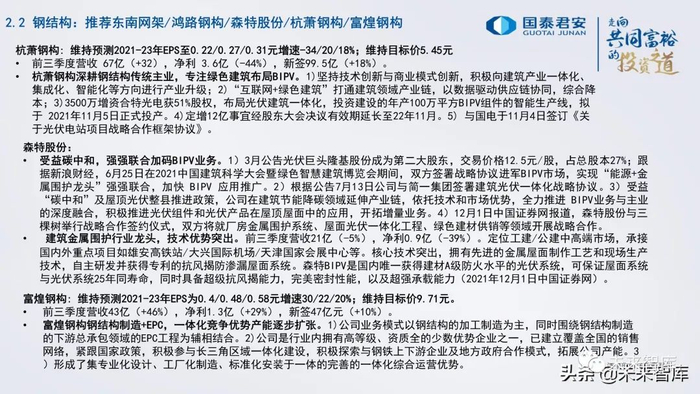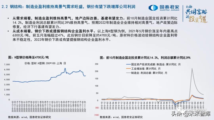 从成本端看,钢价下跌或提振钢结构企业盈利水平。以上海H型钢为例,2021年5月钢价涨至年内最高点6300元/吨,前五月涨幅超过47%,此后钢价目前降至约4700元/吨。原材料价格波动给钢结构企业盈利带来不稳定性,2022年钢价下跌或有望提振钢结构企业盈利水平。