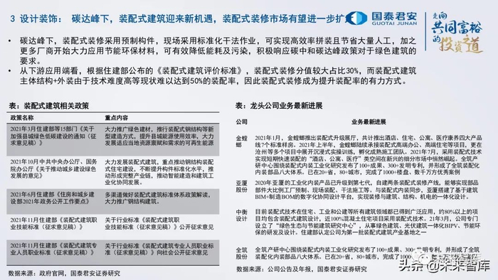 碳达峰下,装配式装修采用预制构件,现场采用标准化干法作业,可实现高效率拼装且节省大量人工,加之更多厂商开始大力应用节能环保材料,可有效降低能耗及污染,积极响应碳中和碳达峰政策对于绿色建筑的要求。