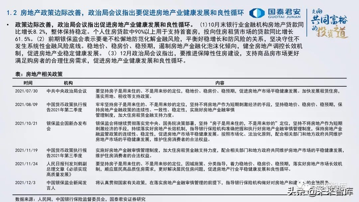 政策边际改善,政治局会议指出促进房地产业健康发展和良性循环。 (1)10月末银行业金融机构房地产贷款同比增长8.2%,整体保持稳定。个人住房贷款中90%以上用于支持首套房,投向住房租赁市场的贷款同比增长61.5%。(2) 前期银保监会表示要毫不松懈地防范化解金融风险,平衡好稳增长和防风险的关系,坚决守住不发生系统性金融风险底线。稳地价、稳房价、稳预期,遏制房地产金融化泡沫化倾向,健全房地产调控长效机制,促进房地产业稳定健康发展。(3)12月政治局会议指出,要推进保障性住房建设,支持商品房市场更好满足购房者的合理住房需求,促进房地产业健康发展和良性循环。