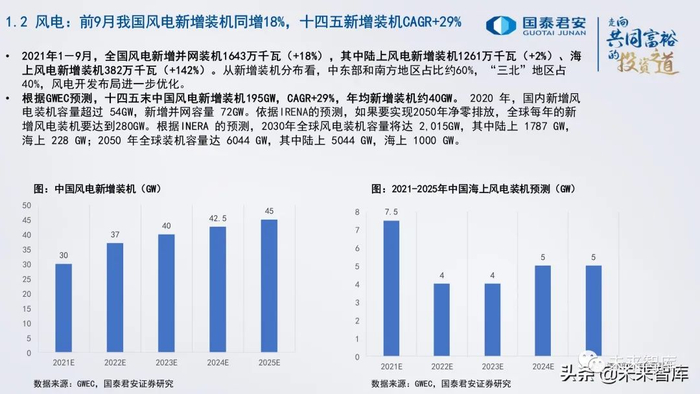 2021年1-9月,全国风电新增并网装机1643万千瓦(+18%),其中陆上风电新增装机1261万千瓦(+2%)、海上风电新增装机382万千瓦(+142%)。从新增装机分布看,中东部和南方地区占比约60%,“三北”地区占40%,风电开发布局进一步优化。