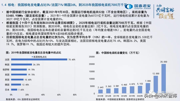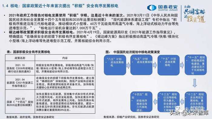 碳达峰等政策要求积极安全有序发展核电。2021年4月19日,国家能源局印发《2021年能源工作指导意见》,明确提出“在确保安全的前提下积极有序发展核电”。《碳达峰方案》指出积极推动高温气冷堆/快堆/模块化小型堆/海上浮动堆等先进堆型示范工程,开展核能综合利用示范。
