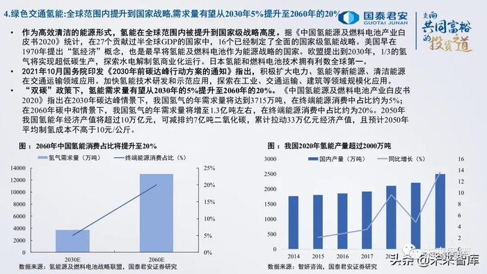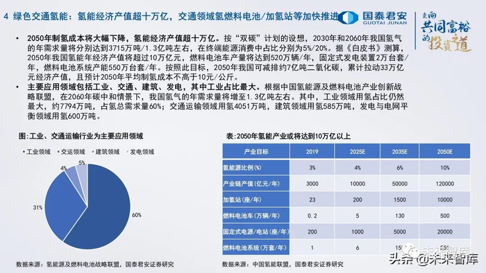 主要应用领域包括工业、交通、建筑、发电,其中工业占比最大。根据中国氢能源及燃料电池产业创新战略联盟,在2060年碳中和情景下,我国氢气的年需求量将增至1.3亿吨左右。其中,工业领域用氢占比仍然最大,约7794万吨,占氢总需求量60%;交通运输领域用氢4051万吨,建筑领域用氢585万吨,发电与电网平衡领域用氢600万吨。(报告来源:未来智库)