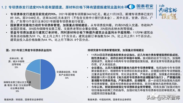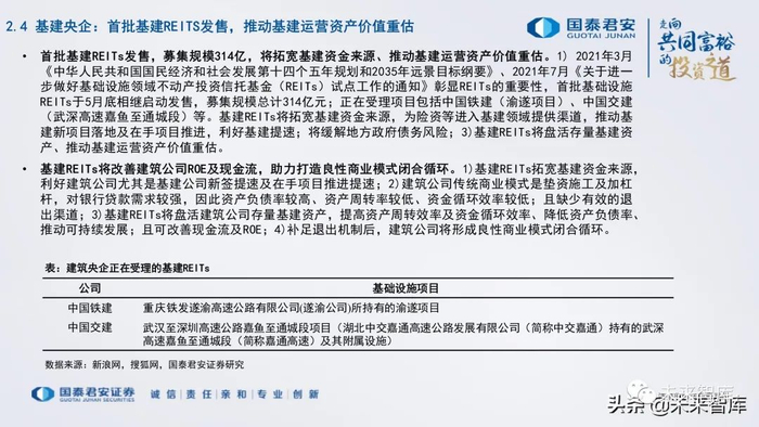 首批基建REITs发售,募集规模314亿,将拓宽基建资金来源、推动基建运营资产价值重估。1) 2021年3月《中华人民共和国国民经济和社会发展第十四个五年规划和2035年远景目标纲要》、2021年7月《关于进一步做好基础设施领域不动产投资信托基金(REITs)试点工作的通知》彰显REITs的重要性,首批基础设施REITs于5月底相继启动发售,募集规模总计314亿元;正在受理项目包括中国铁建(渝遂项目)、中国交建(武深高速嘉鱼至通城段)等。基建REITs将拓宽基建资金来源,为险资等进入基建领域提供渠道,推动基建新项目落地及在手项目推进,利好基建提速;将缓解地方政府债务风险;3)基建REITs将盘活存量基建资产、推动基建运营资产价值重估。