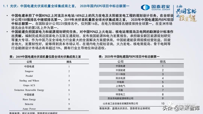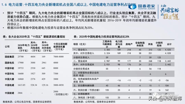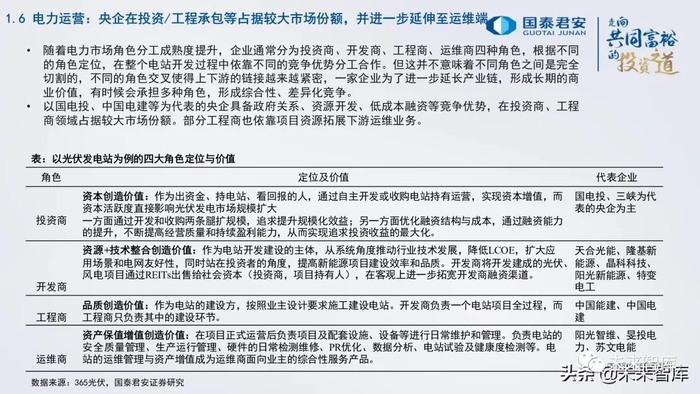 以国电投、中国电建等为代表的央企具备政府关系、资源开发、低成本融资等竞争优势,在投资商、工程商领域占据较大市场份额。部分工程商也依靠项目资源拓展下游运维业务。