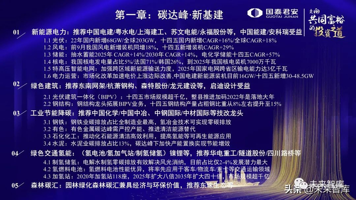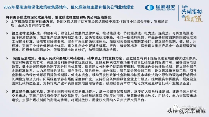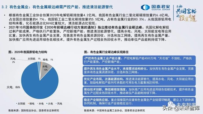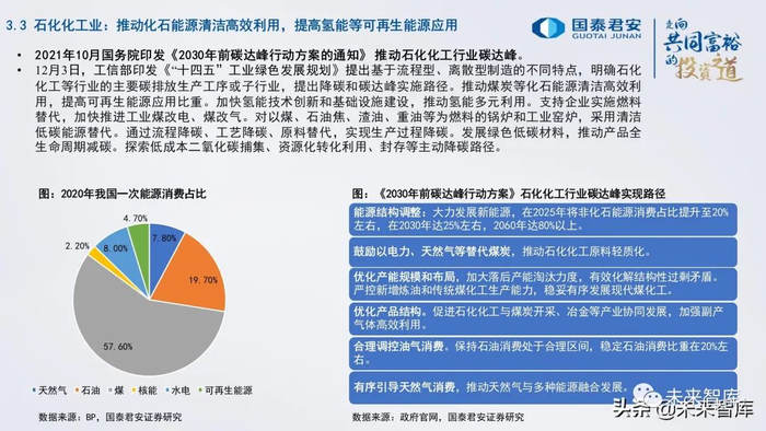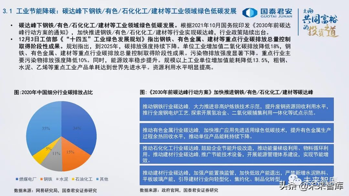 碳达峰下钢铁/有色/石化化工/建材等工业领域绿色低碳发展。根据2021年10月国务院印发《2030年前碳达峰行动方案的通知》,加快推进钢铁/有色/石化化工/建材等行业实现碳达峰,行业政策陆续出台。