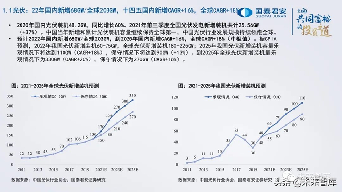 预计2022年国内新增68GW/全球203GW,到2025年国内新增CAGR+16%,全球CAGR+18%(中枢值)。据CPIA预测,2022年我国光伏新增装机60-75GW,全球光伏新增装机180-225GW;2025年我国光伏新增装机容量乐观情况下将达到110GW(CAGR+18%),保守情况下将达到90GW(+13%)。到2025年全球光伏新增装机量乐观情况下为330GW(CAGR+20%),保守情况下为270GW(CAGR+16%)。